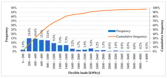 Finally, Figure 12 reports the so-called flexible loads, by adding up the storable loads and the shiftable ones. Therefore, it basically represents the dwellings potential of flexibility showing an average value equal to 1042 kWh/y. Notwithstanding, only 31.6% of homes have the flexible loads value just below 600 kWh/y; 57.3% of homes have the flexible loads lower than 1000 kWh/y, whereas only 12.1% can get amounts higher than 2000 kWh/y.