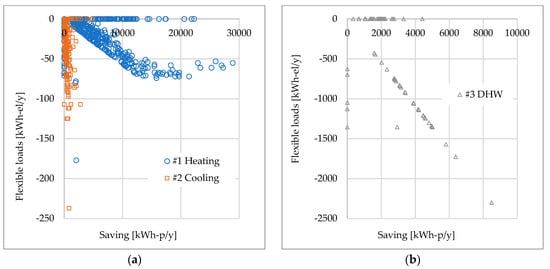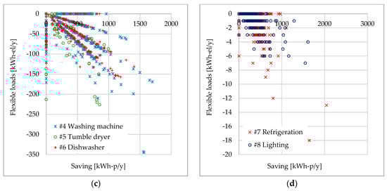 Changes in potential of flexibility vs. energy savings (as a function of primary energy) related to the evolutionary scenarios: (a) Heating & Cooling; (b) DHW; (c) Washing; (d) Refrigeration & Lighting.