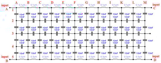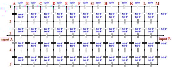 The network of our Calibrator “Model A” is implemented as flat model with 5 × 12 partition steps. PD, breakdowns or short circuits between the junctions can be implemented with an external circuit, which can be connected between any junctions of the circuit. Schematic of this network for simulating is shown in Figure 1. The numerical calculation of individual model nodes is performed in Matlab software, Matlab Simulink is used to calculate steady state.