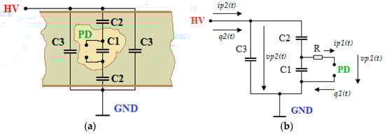 The simulation of PDs is performed by a fast change of part capacity between two junctions. The behavior of the circuit is based on the Gemant and Philippoff model []—three capacitance circuit schematically illustrated in Figure 3. More precise models can be based on Böning [,]—five capacitance model or Eberhard Lemke dipole model based on Paderson assumptions [].
