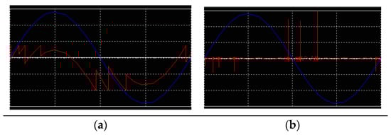 Most of the faults in real objects are not symmetrical. Typically, they are not located in the vicinity of the axis of the object or its central part. They can be also located at its edges or near the input electrodes. The voltage drop on the fault or the current taken from the power supply is not symmetrical. An example may be the connection of external circuit between 2B and 2C junctions. The set peak value of PD q2(t) is 10 pC. The voltage drop on the external circuit vp1(t) and the impulse current ip2(t) taken from the power supply is shown graphically in Figure 4. Red curve—voltage drop waveform on fault and current pulses, blue curve—waveform of applied voltage.