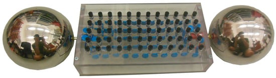 “Model A” is made of 10 nF ceramic capacitors type CC81 with a low dissipation factor < 0.5%. The maximum voltage of the “Model A” is 30 kV and the maximum voltage drop Vp1 between two junctions is about 3 kV in the idle state. However, the simulations showed that the impulse voltage drop vp1(t) on the capacitor at current impulse of PD can reach up to 7.5 kV. Therefore, capacitors with a nominal voltage of 10 kV were chosen. The value of the transferred charge q2(t) is dependent on the choice of PD location and the settings of the threshold voltage vt1(t) of the ignition system. The model is designed for a wide range of transferred charge q2(t) from 0.1 to 1000 pC. Low corona connection is provided by the external spherical electrodes. And this model offers an easy option of reconfiguration and setting the correct value of pC with the help of software simulators. All 60 junctions are available for connecting the ignition system. The model also allows for creation of asymmetric faults. The physical realization of the “Model A” is shown in Figure 6.