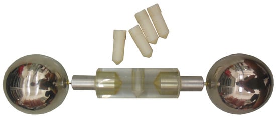 The input electrodes of “Model B” are made of aluminum in conical design. The construct material is a homogeneous cylinder of PMMC. Into the radial cavity located in the middle of the cylinder, it is possible to insert other kinds of solid or porous materials. Inhomogeneous electric field is produced in the vicinity of the input electrode. However, the electric field becomes uniform in the direction to the cavity. The formation of PD is minimized inside a homogeneous part of cylinder and discharged are appearing only in the cavity. Mineral oil or petroleum jelly can be used to prevent the formation of undesirable PD in the transition of the air gaps between the cylinder material and the tested material. The design of the model prevents the formation of the external corona of up to 100 kV between the external electrodes. Corona is eliminated by the smooth design of the model. For very accurate measurement with very low PD background noise of 150–200 fC at 100 kV in frequency range of 50 to 500 kHz, it is possible to use the external spherical input electrodes.