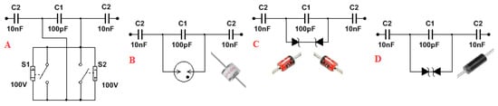 The ignition system is designed for the “Models A” and “C”. The purpose of this ignition system is to ensure the relocation of the charge q1(t) within the test object. The charge q1(t) is determined by the ignition voltage and the value of the capacity C1, which can be shorted. The ignition voltage can be set from the units of Volts to the hundreds of Volts. Coupling capacity can be chosen from pF to tens of nF. It is possible to drive the ignition system by fast electronic circuit. However, a simpler solution is to use same of different Zener diodes “C”, transils “D” or gas surge protections “B”. The disadvantage of this solution is only one set value of the ignition voltage. For the change of charge or ignition voltage values, it is necessary to change the electronic component coupling capacitors C2 or value of working capacitor C1. All electronic schematics of the tested ignition system are shown in Figure 8. In all cases the value of the transferred charge q1(t) it is possible to determine for one ignition of the PD (one current pulse ip1(t)) or for all the impulses within one period. The charge change value q1(t) at the fault location or the charge change value q2(t) of the whole calibrator circuit can be determined by calculation or SW simulation.