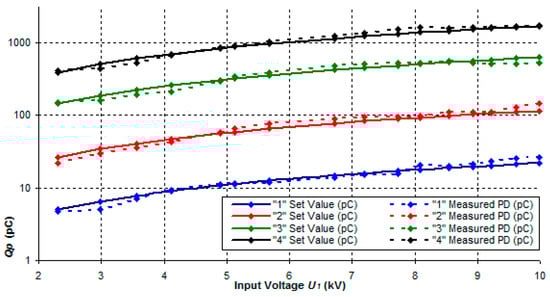 Simulated PD values are calculated for voltage range 2.3 to 10 kV of input voltage V1. All practical measurements were performed on “Model A” and measured by DDX 8003. The result of the measurement is the verification of the correct function of the physical calibrator “Model A” in the whole range of simulated charges from pC to nC. The measurement results are shown graphically in Figure 9. The test also included a withstand voltage test and a corona test at a maximum voltage of 30 kV. Corona did not appear in practical measurements.