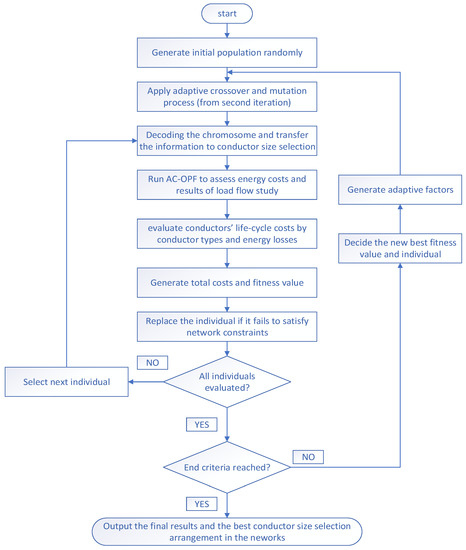 - After the power flow analysis and calculation in the AC-OPF module and the LCC assessment module, the fitness value of each individual (sum of the system level conductor LCC, the total energy procurement costs and energy losses costs) is confirmed.