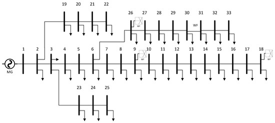 The proposed CCS optimization approach is tested on a 33-bus network in this section, where three wind generators are connected to the network at branch 9, branch 18 and branch 26. The single line diagram of this 33-bus distribution network is shown in Figure 2, and the relevant operation data and network constraints are listed in Table 5.