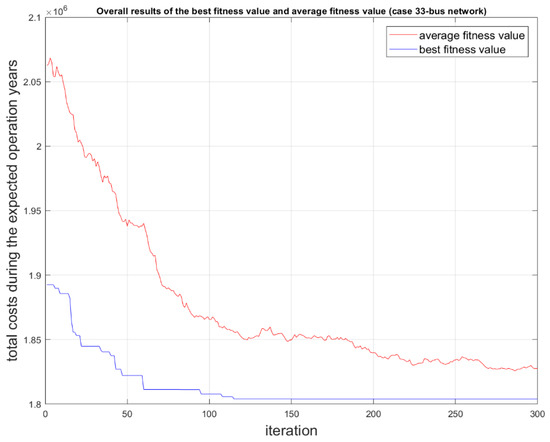Overall results of the best fitness value and average fitness value (case 33-bus network).