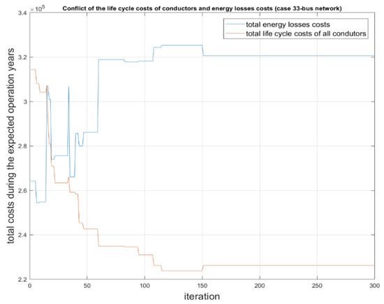 Conflict of the life cycle costs of conductors and energy losses costs (case 33-bus network).