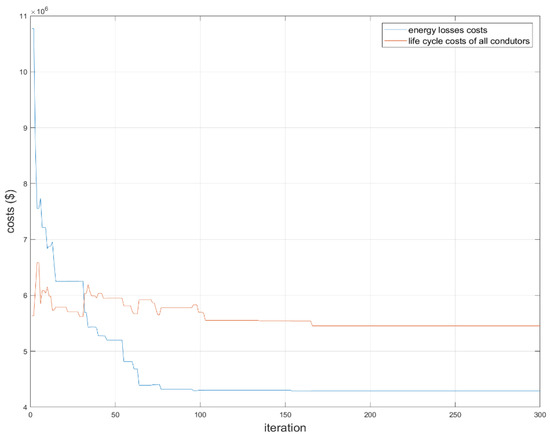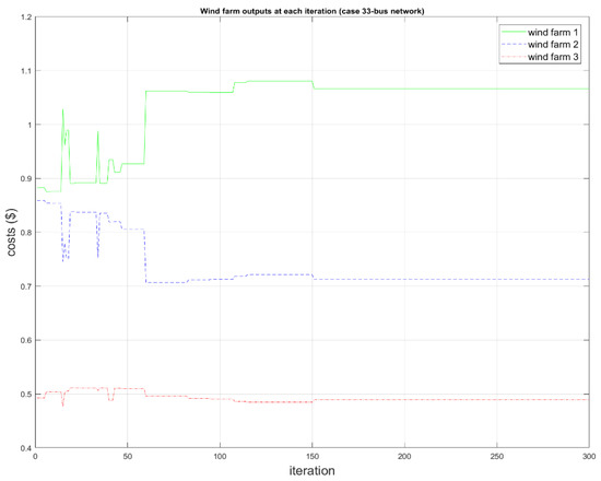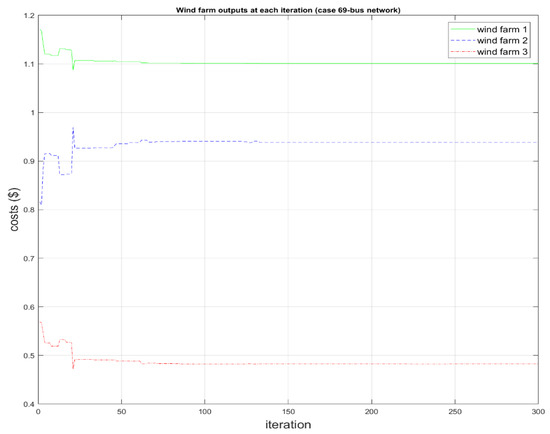 Similar to the results of the 33-bus system, Figure 12 reveals the conflict between total energy losses and the life cycle costs of all conductors in the 69-bus network, thus proving that the proposed algorithm can successfully achieve the balance between these two contrary costs. Figure 13 indicates the optimum power consumption of the wind farm generations in each iteration in the case of the 69-bus system. Similar to the results in the 33-bus system, parts of the available capacity are curtailed for achieving the minimum total costs (including total energy losses costs, energy purchase costs and conductor’s investment costs).