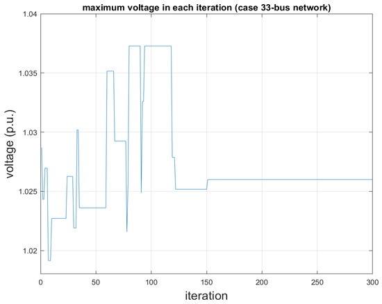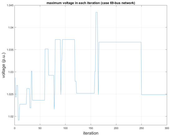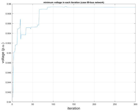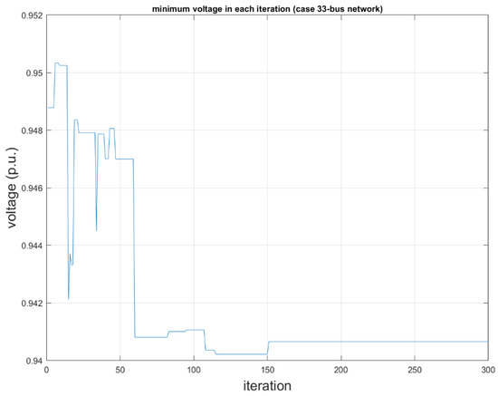 Similar to the results in the case study of the 33-bus network, the individuals that cannot satisfy the minimum and maximum voltage constraints are eliminated and replaced by the new individuals that can satisfy the constraints. Figure 14 and Figure 15 illustrate that the minimum and maximum voltage occur in each iteration and proves that the proposed approach can successfully ensure all the individuals satisfy the voltage constraints (0.94 to 1.1 p.u.).
