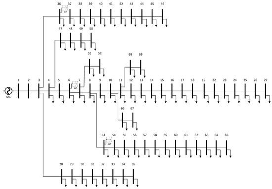 Same as the case of IEEE 33-bus network, the quadratic generation cost function of the main generator connected at node 1 is expressed in Equation (25) and the wind farm is also considered as a zero marginal cost generator in the case of 69-bus network.