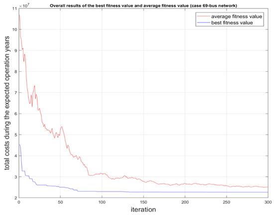 Overall results of the best fitness value and average fitness value (case 69-bus network).