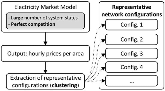 Building on the methodology, according to Step 4, the model is executed under perfect competition conditions. Subsequently, the network configurations derived from the electricity prices in every area resulting from this execution are classified into the representative configurations calculated in Step 2, as represented in Figure 2. In a real situation, this process would be part of the regular activity of the agents or regulators for decision-making.