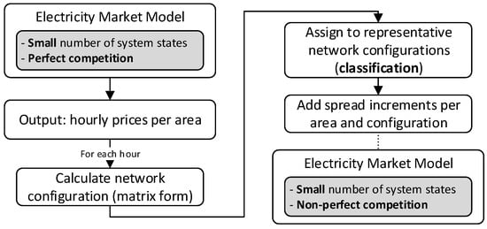 - The model under perfect competition in Step 1 is run again, this time under normal conditions in terms of the number of system states (significantly less than the number used in the initial computation in Step 1), which yield a solution notably quicker. For each hour, the resulting prices’ configuration is classified into one of the main representatives.