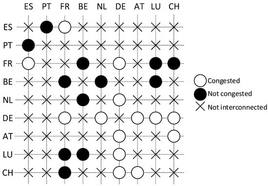 In this sense, a network configuration is defined by the state of the interconnections in terms of congestion, as exemplified in Figure 3. It can be represented as a symmetric matrix , where n equals the number of countries studied and each element corresponds to the interconnection between country a and and can be defined as Equation (7).