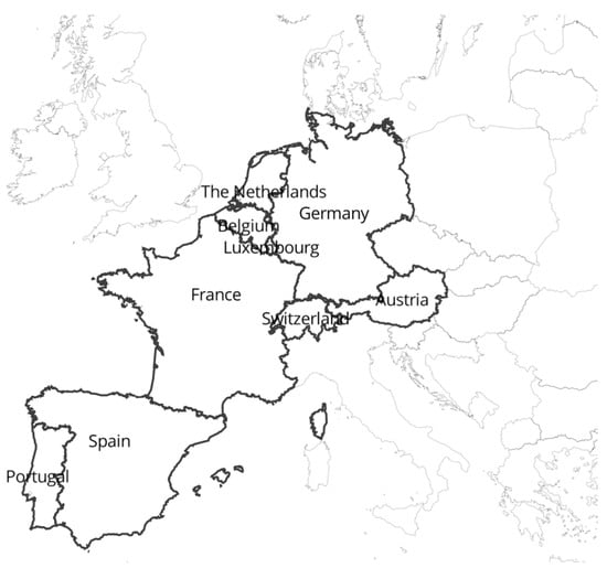 For this case study, the countries which belong to the Iberian and CWE electricity markets were considered. Those include Portugal, Spain, France, Switzerland, Austria, Luxembourg, Belgium, Germany, and the Netherlands, as shown in Figure 4.