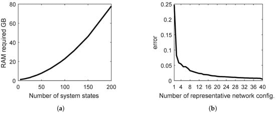 (a) The trade-off curve between the number of system states used in the model against the RAM required for execution. (b) The trade-off curve between the number of main network configurations against the accumulated error.