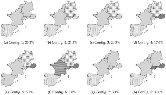 In Figure 6, the eight representative network configurations are shown, accompanied with the percentage of hours following this pattern. Many factors, either in terms of regulatory changes, technical modifications of the system, or others, can make prices change significantly over time. That is why a calculation of the representatives must be made not only once but also from time to time as markets evolve.