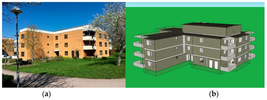 The city block that was the case for this study contains 99 apartments, of which 35 are assisted-living accommodation for elderly people. Elderly people have their own apartments with a safety alarm, and two healthcare providers (private and public) operate in the building, as well as a nurse. The building complex consist of five different buildings, where it is possible to walk between three of them without having to go outside (they are in the same building body); the other two buildings are detached three-story buildings with 15 apartments in each, evenly distributed on the three stories. No renovation was done since the block was built in 1983, with only minor repairs taking place. This type of housing includes a canteen where lunch is served, and there are also leisure activities in which all elderly people in the municipality can take part. Most of the people living in the block are at least 65 years old. Tenants in this specific building complex rent an apartment directly from the property owner, and the people in need of assisted living rent their apartment from the municipality. There is also a residence for elderly people with dementia in a separate part of the building complex. The building that was modeled and simulated was one of the two detached buildings. The building and the simulation model can be seen in Figure 1. Technical data of the modeled building, as well as data of its location, can be found in Table 2. This specific city block is geographically located in Östergötland, a county in the south of Sweden that has a continental climate and belongs to the northern part of the temperate zone.