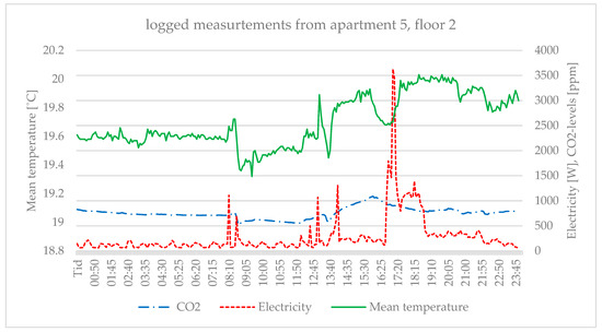 The mean temperature in the 12 apartments varied between 19.5 °C in the coldest apartment to 22.1 °C in the warmest apartment during the measuring period. This may seem odd; however, in interviews, some of the tenants stated that they used to turn down their radiators since they liked it a bit cooler inside. Domestic hot-water use was calculated from the total use for the city block to 345 L/m2 and year, which led to a total energy use for heating of water as 34.9 MWh in the modeled building. From all 12 apartments, logged measurements of indoor temperature, CO2 levels, relative humidity, and electricity use were collected for a week, and results from 19 November in apartment 5 on the second floor can be seen in Figure 2 (see Figure 5 for construction plan).