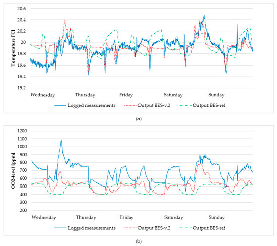 Logged measurements compared to simulated output from apartment 5 on the second floor, for both reference building energy simulation (BES-ref) and building energy simulation version 2 (BES-v.2), from Wednesday 19 November to Sunday 23 November: (a) mean temperature; (b) CO2 levels.
