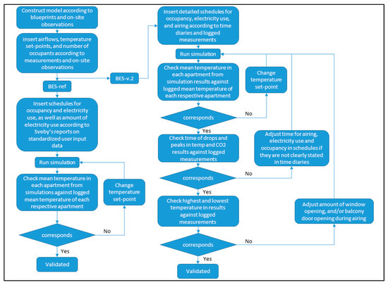 The validation of the BES models was done with empirical validation. BES-ref was validated against mean indoor temperature from the measurements, and BES-v.2 was validated against temperature and CO2 graphs from the measurements, making sure that the graphs from the simulations followed the graphs from the measurements as described above. The validation and calibration process used in this study can be seen in Figure 4.