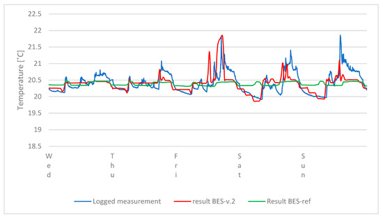 The process of calibrating the schedules for electricity use, airing, and occupancy was then done. The schedule for electricity use was altered slightly after each simulation so that the simulated graph eventually mimicked the graph from the measurements as closely as possible, and the total amount of used electricity for each day was compared to the total simulated electricity use for the same day after each simulation, making sure that they matched. In the same way, the airing and occupancy schedules were slightly altered after each simulation until the simulated temperature and CO2 graphs corresponded with the measured temperature and CO2 graphs in a satisfying way (see Figure 3). The simulated mean temperature for the week was also checked against the measured mean temperature to make sure that they corresponded. The validation criteria for mean indoor temperature was ±0.1 °C for both BES-ref and BES-v.2, while the criteria for highest and lowest indoor temperature was ±0.1 °C for BES-v.2 if it was feasible. For electricity use, it was ±5% kWh, and, for the start and end time of drops and peaks in temperature, CO2 levels, and electricity use, it was ±30 min. The same procedure was performed for each apartment and its corresponding zone in the model.