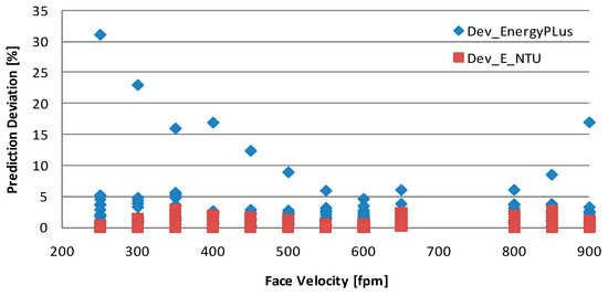 Relative deviations from manufacturer’s data predicted by the effectiveness-NTU model and EnergyPlus.