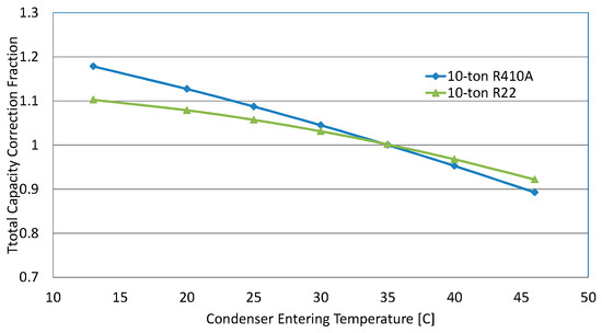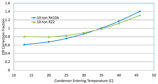 The condenser evaporative pre-cooling achieves energy savings by lowering the air temperature entering the condenser coil. Consequently, the energy saving effect is directly related to how the working refrigerant responds to the entering air temperature. To have a direct comparison, we obtained product literature and reduced the data in the forms of EnergyPlus equipment performance curves (Equations (14)–(17)). The comparisons of the performance curves at the full compressor capacity between a 10-ton (rated cooling capacity of 35.2 kW) R-22 rooftop unit and a 10-ton R-410A rooftop unit can be seen in Figure 2 and Figure 3. Both the units have a rated cooling COP of 3.0 at 35 °C (95 °F) outdoor air temperature and 26.7 °C DB/19.4 °C WB (80 °F DB/67 °F WB) indoor air, With fixing indoor wet bulb temperature at 67 °F (19.4 °C), Figure 2 shows the capacity correction ratio (capacity at various ambient temperatures versus the rated capacity at 35 °C) and Figure 3 shows the EIR correction ratio (EIR at individual temperatures versus the rated EIR), as a function of the air temperature entering the condenser coil. At 35 °C, i.e., the rated condition, the ratios are unity. With lowering the air temperature, the capacity correction fraction increases while the EIR (reverse of cooling COP) correction fraction decreases, because the units deliver higher capacities with lower power consumptions at reduced temperatures.