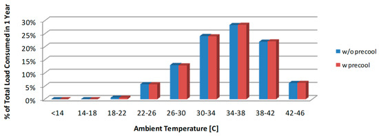 Building types represent different load distributions. For example, in Phoenix, AZ, the load profile in a medium office building is different from that in a supermarket as shown in Figure 4 and Figure 5, respectively. In cold weather, when the ambient temperature is low, the load in the supermarket is practically zero (no cooling needed, only perhaps heating), whereas in the medium office building heating and cooling may be needed depending on the zones in the building because the loads in the exterior portions are different from that in the interior portions. Most of the cooling load in the supermarket is in the hotter months, whereas in the medium office building, the cooling loads are distributed over more temperature bins. The building load distributions lead to utilizations of evaporative precooling at different ambient conditions.