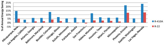 - Relative energy savings are much greater for HVAC systems with the refrigerant R-410A than they are with R-22. The relative energy savings and peak power reductions of the R-410A unit is 10% higher than the R-22 unit in hot and dry climates.