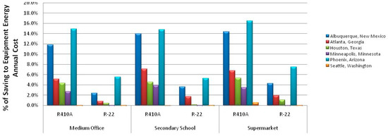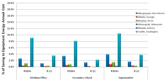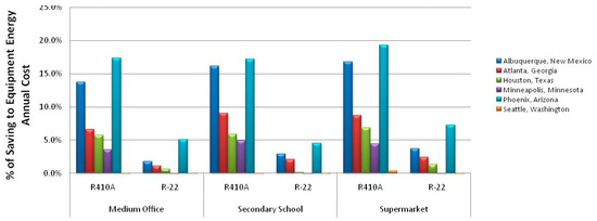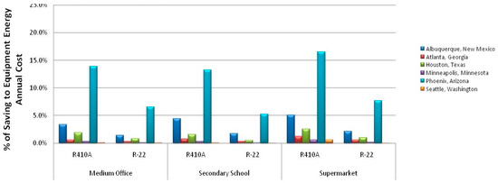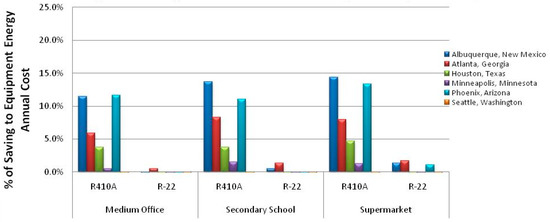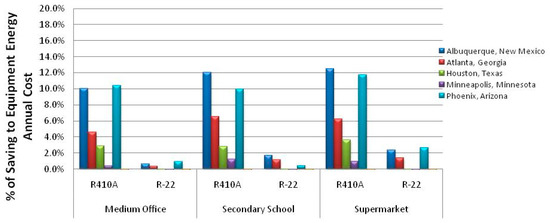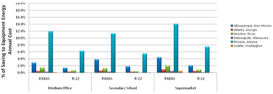 Using EnergyPlus, we estimated the annual power savings for R-410A rooftop equipment in Phoenix, AZ, for the three classes of buildings (present buildings): medium office, secondary school and supermarket, as shown in Figure 6.