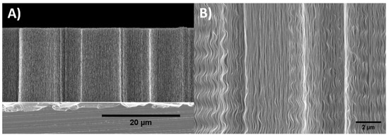 (A) Side view SEM image of a CNT array grown on a silicon substrate using the CVD process; and (B) high magnification view of the CNT array, which resolves the individual strands.