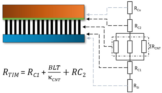 Simple schematic of the origin of the different thermal resistance contributions in the CNT array TIM. The black contributions were included in the thermal interface resistance results that were obtained from the laser flash experiment [15].