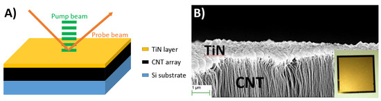 (A) Schematic illustration of the three-layer PPR measurement; and (B) SEM image of the CNT covered Si samples after sputtering of TiN [15].