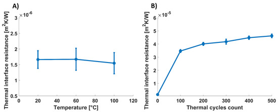 The laser flash measurements were first conducted on CNT array TIMs before cycling and then at every consecutive 100th cycle up to the completed 500 cycles. Thermal interface resistance results calculated after measurement for samples before and during cycling are presented in Figure 5A,B, respectively. Before thermal cycling, the CNT array TIMs had an average thermal interface resistance of of 1.7 mmK/W ± 0.28 at 20 C.