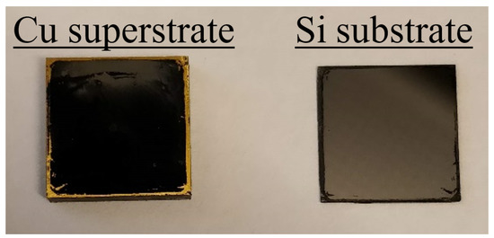 It should be noted that some of the measured samples exhibited an even sharper increase in terms of thermal interface resistance during the cycling. However, these samples delaminated by themselves before the thermal cycling could be completed and were for that reason disregarded. All of the samples were delaminated by shearing, which showed that all samples, before and after thermal cycling, detached on the Si/CNT side of the interface leaving all the CNTs on the Cu superstrate side, as shown in Figure 6.