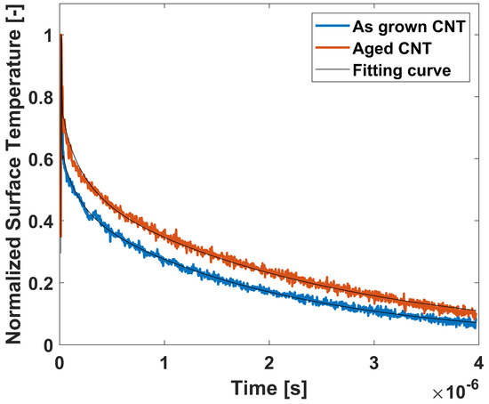 Figure 7 shows the measured temperature response from the PPR measurements. Before thermal cycling, an effective thermal conductivity () of 71 W/mK and a thermal boundary resistance (R) of 0.96 mmK/W were found. Together with the R value obtained from the laser flash measurement presented in Figure 5A, R could be calculated using the thermal interface relation stated in Figure 3. This relation gave a R of 0.49 mmK/W for the CNT array TIMs. By comparison, this means that the polymer functionalization was about twice as good as the Si/CNT boundary on the other side of the interface in terms of thermal boundary resistance.