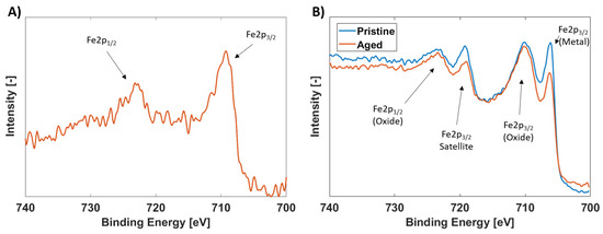 XPS analysis results of the Fe peak: (A) from the roots of the CNTs remaining on the Cu superstrate after delamination; and (B) from the Si substrate after delamination before and after thermal aging.