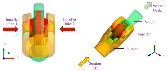 The 3D model for the computational domain was developed with PTC CREO Parametric 4.0. It was designed according to a specific speed ns of 89.5 in Equation (14). The flow domain is divided into three sections. The impeller is a shrouded radial flow double-suction impeller with six twisted blades. The suction domain, which is semi-spiral in shape, has a single inlet and dual outlets. The flow on entering the suction unit split into two outlets to feed both eyes of the impeller. Each suction outlet has flow directing baffles introduced (suction tongue) to reduce the pre-swirl towards the impeller eye to reduce incidence losses at the impeller inlet. The pump has a single volute serving as the discharge and outlet unit. Figure 2 shows the pump model under investigation and the calculation domain, and Table 1 presents the design specifics of the pump.