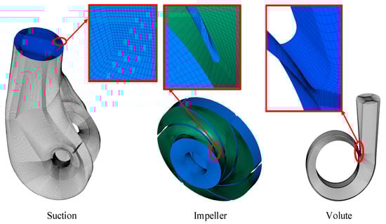 The flow passage for the tested pump was meshed with ANSYS ICEM 18.0 mesh tool. A hexahedral grid system was generated in the computational domain using O-type grids near the blade and H/C type grids near the leading with the trailing edge. The grid size and blocking method were used and the grids for the impeller and suction chamber were refined with large numbers for higher precision. A single blade passage was first meshed and transformed to six blades to make the full blade set. At the volute tongue region which is known to be very complex, the grids were concentrated. The leading and trailing edges of the impeller were also further refined to improve computational accuracy. The boundary layer and grid growth were set to ensure the density and thickness of the boundary layer mesh. An overview of the computational mesh is shown in Figure 3. To speed up the calculation time and still maintain accuracy in iterations, it is necessary to carry out a grid-independence analysis for the numerical simulation. Based on similar works [27,28,29,30], five independent high quality structural hexahedral meshes were built and a grid sensitivity analysis was executed. Simulations were performed at steady state at the design flow rate of Qd = 0.139 m3/s to determine the mesh influence on pump head and efficiency.