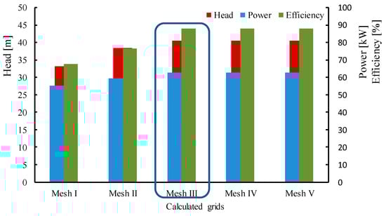 The performance comparison for the five independent grids is presented in Figure 4. For Mesh I and II, the calculated performance indicators were lower than the design performance characteristics of the pump. The head, efficiency and power reached the design values when the mesh number was increased to 4,266,423 elements. For the subsequent mesh with higher grid numbers, the effects of the mesh density on the hydraulic performance remained fairly constant. Mesh III, Mesh IV and Mesh V were compared since they each met the design criteria for the pump. The effect of the higher mesh numbers on the pump performance was 0.025%, 0.01% and 0.075% for head, efficiency and power respectively. This suggested that numerical accuracy stabilized as the grid number increased to 4,266,423 elements. Mesh III was therefore used for the computations to reduce calculation load and computation time. The mesh density for the independent grids are presented in Table 2.
