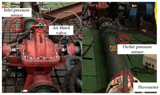 The pump performance tests were done at the open test rig system. The test rig schematics can be seen in Figure 5. The test system and the tested pump are shown in Figure 6. An air bleed valve was installed at the highest point of the volute to get rid of entrained air in the pump. During operation of the pump, the air bleed valve also supplies water to the mechanical seals to cool them. The diameter of the suction pipe is 250 mm and the diameter of the outlet pipe is 200 mm. The flow rate was measured with an electromagnetic flowmeter with uncertainty 0.07%, and it is installed in the outlet pipe line, 2500 mm from the pump. The fluid pressure at suction and discharge points was measured with high-precision pressure transmitters with uncertainty of 0.5%, which were installed directly in the pipeline. The pressure transmitter at the suction end is installed at 500 mm from the pump, whereas the outlet transmitter is installed at 1000 mm.