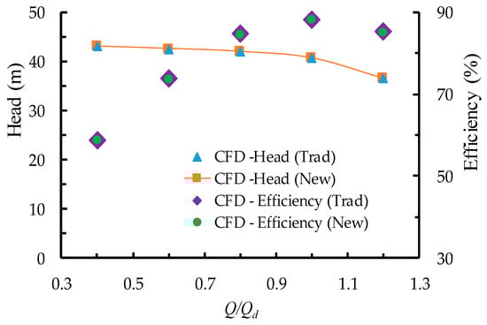 Numerical calculation for the non-cavitating pump was performed for different flow conditions, thus 0.4Qd∓1.2Qd. Figure 7 presents a comparison of performance characteristics for the two boundary pairs. The least deviation in numerical head was 0.008%, and this occurred at the design point, whereas a maximum deviation of 0.239% occurred at the deep part load. The numerical efficiency recorded a minimum deviation of 0.037% at the design point, meanwhile the maximum deviation was 0.262%. Looking at the deviation in numerical results for the two boundary pairs, either boundary pair can be used for the experimental validation since the difference is very minimal.