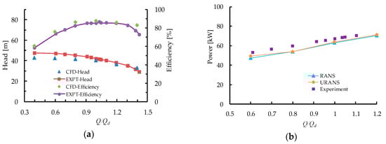 Computational results from the new boundary pair were matched with the experiments in Figure 8a. The pump head dropped gradually as the flow rate was increased, and the trends between the numerical and experimental heads were quite similar. The experimental head was however higher than the numerical head whereas the efficiency from the test results was lower than the calculate efficiency. The experimental head at the BEP was 41.49 m, and the corresponding efficiency was 86.63% at a flow rate of 0.144 m3/s, whereas the BEP for the numerical predictions occurred at head 40.24 m and efficiency 88.39 % at the design flow condition of 0.139 m3/s. The relative errors at the BEP were 3.01% and 2.03% respectively. The experimental head at the design point was 41.83 m and efficiency 85.20%. Figure 8b is a comparison of the mechanical power from the steady (RANS) and unsteady (URANS) simulations results. The mechanical power from the simulations were computed using Equation (17), and the power from the experiments was computed using Equation (34). The results from the steady and unsteady simulations were very similar. Therefore, the steady-state simulations could be used to predict similar results. Overall, the agreement between the results from the experiments and the simulation was very good, and this affirmed the reliability of the numerical approach.