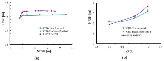 NPSHr prediction and comparison: (a) Cavitation characteristics at Qd; (b) suction performance at Q/Qd.