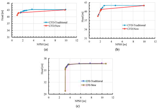 Figure 10a–c compares the two numerical methods used in the NPSH prediction for design and off-design flow conditions. For the traditional method, the gradual reduction method was used to predict the NPSHr whereas the novel method used a combination of a new boundary pair and an algorithm to estimate the corresponding static pressure at the pump outlet when the head drops by 3%. At 0.6Qd, the traditional method used 11 calculating steps to predict a 3.12% head drop while the new approach predicted a 3.20% head drop after 5 calculation steps. This is shown in Figure 10a. The NPSHr prediction steps at 0.8Qd are shown in Figure 10b. At 0.8Qd, the NPSHr was predicted in 11 simulations using the traditional method. The new approach, however, used six steps to predict the critical cavitation point. This indicates that the new method reduced the calculation time by 45.45%. At the design point, the prediction was achieved with five simulations when the new method was applied. The traditional method for the design point calculated the critical cavitation point in 10 simulations. There was a 50% reduction in the number of simulations at the design point, and the comparison of the two methods can be seen in Figure 9a. When the flow was increased to 1.2Qd, the new method predicted the NPSHr within five calculation steps while the traditional method required nine simulations to reach the critical cavitation point. At overload condition, the new method reduced the calculation time by 44.44%. Figure 10c is a comparison of the prediction methods at overload condition.