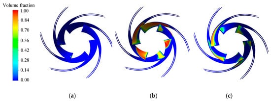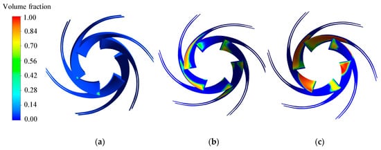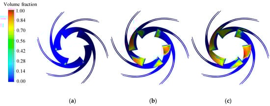 Volume fraction distribution in impeller at 0.6 Qd: (a) NPSH0% = 10.06 m; (b) NPSH1% = 2.35 m; (c) NPSH3% = 2.16 m.