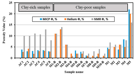 The discrepancies in porosity or pore size distribution between MICP, NMR, and LP-GA porosimetry are largely controlled by shale compositions, particularly, the clay minerals. The clay-rich shales generate NMR porosity significantly higher than MICP and helium porosity, while the clay-poor shales exhibit a high porosity consistency between NMR, MICP and helium porosimetry.
